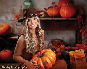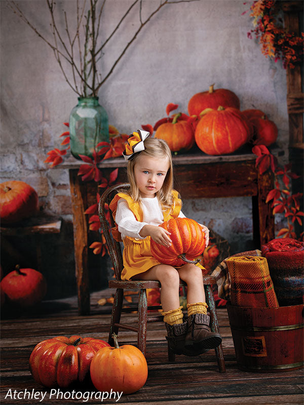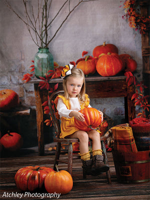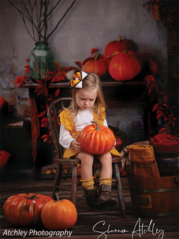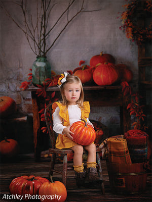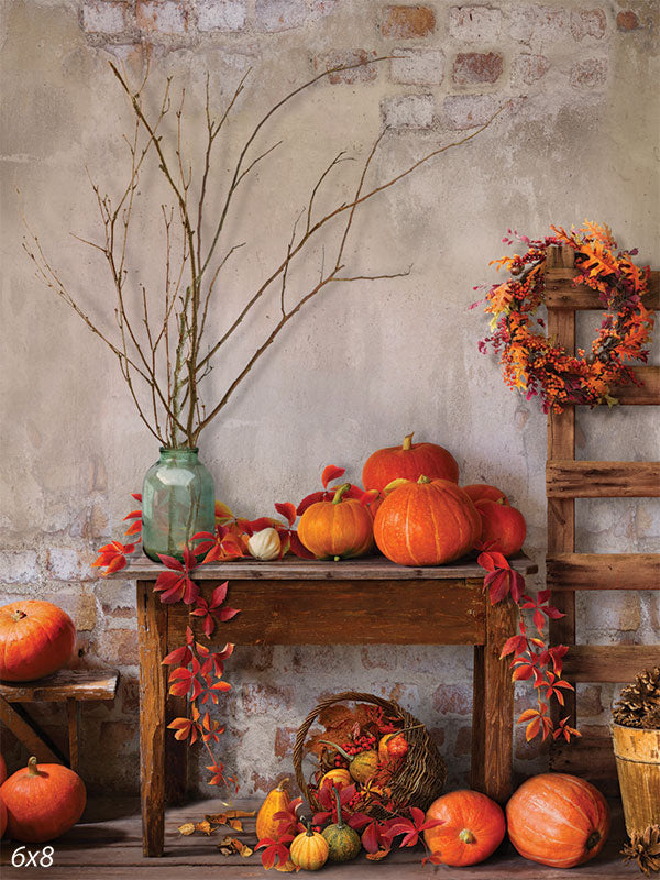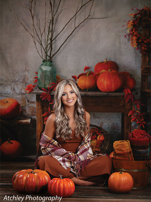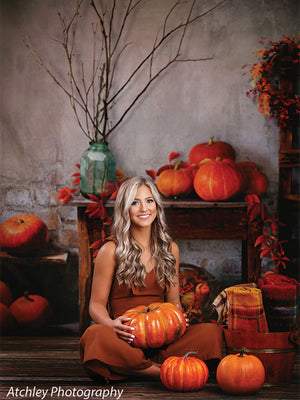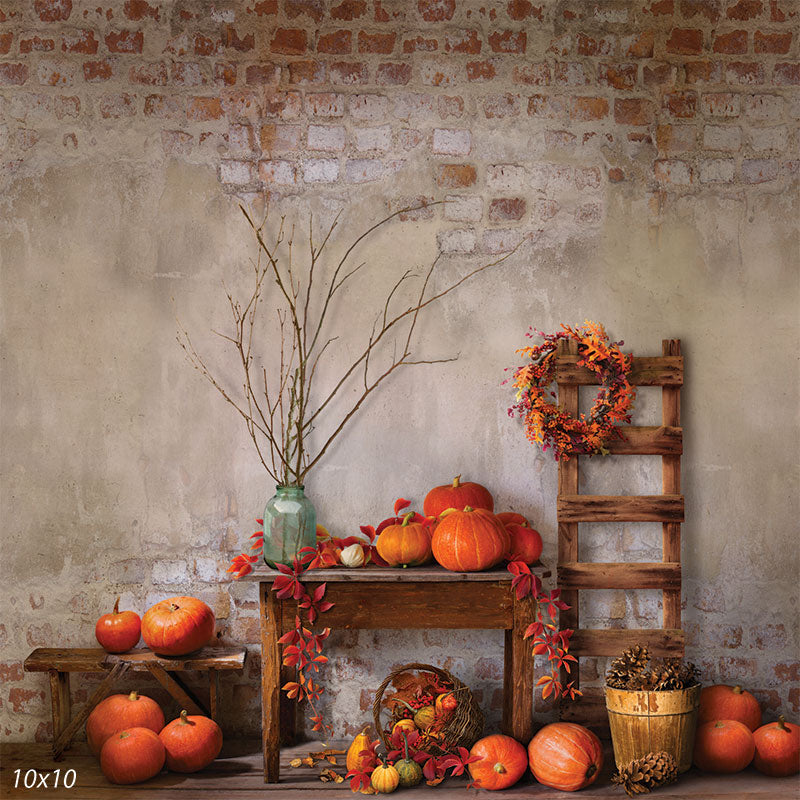 Bring the essence of autumn harvest into your photoshoots with our Rustic Harvest Photography Backdrop. This backdrop sets the perfect scene for capturing the cozy, warm ambiance of fall, featuring an arrangement of pumpkins, vibrant foliage, and a rustic wooden table against a textured wall. Its rich colors and natural elements create a charming, rustic setting ideal for a variety of photography sessions.