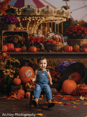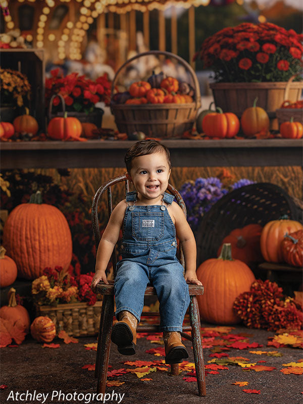 This backdrop combines the best of two autumn traditions: the grounded warmth of harvest season and the joy-filled glow of a fairground. The thoughtfully arranged foreground provides a perfect posing area with natural textures and rich seasonal colors, while the softly blurred carnival lights in the background add depth, whimsy, and storytelling. It’s a ready-made scene that elevates seasonal portraits with both charm and professional polish.