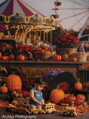 Celebrate the warmth and wonder of the season with our Nostalgic Fairground Photo Background. This richly detailed backdrop blends the rustic charm of a harvest display with the whimsical glow of a twilight carnival—perfect for fall mini sessions, family portraits, and festive seasonal events. In the foreground, weathered wooden crates, baskets brimming with chrysanthemums, and scattered pumpkins create a cozy, abundant scene. In the distance, a glowing carousel and Ferris wheel bring playful fairground nostalgia, bathed in the soft, golden light of autumn dusk.