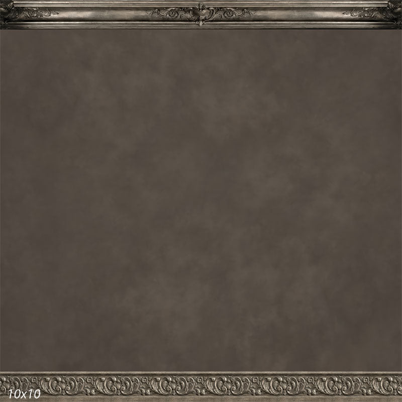 This printed photography backdrop features a muted gray textured wall surface framed by subtle decorative accents along the top and bottom edges. The restrained gray tones create a calm, neutral setting that keeps attention centered on the person positioned in front, while the gentle tonal movement prevents the background from appearing flat under studio lighting.