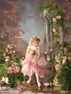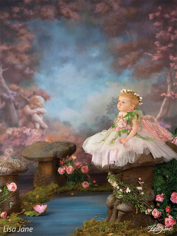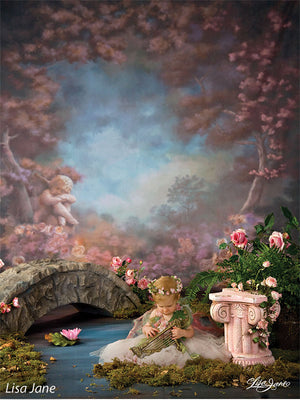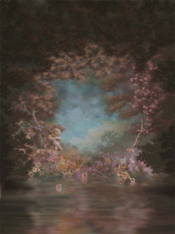 Create enchanting, storybook-inspired settings with the Floral Cherubs Photography Backdrop. Featuring delicate cherub figures nestled among vibrant florals, soft tree canopies, and a serene water reflection, this backdrop evokes romance and whimsy—perfect for portraits and artistic photography.