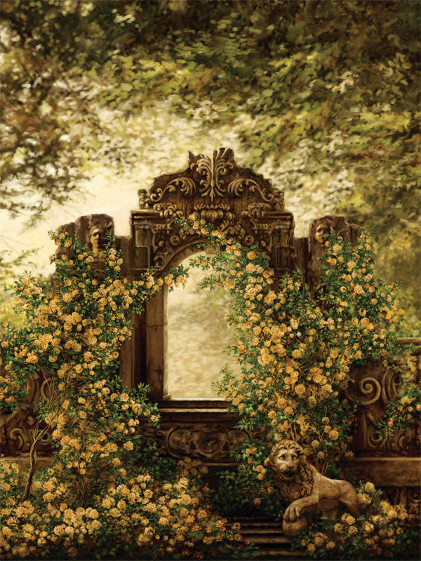 The Antique Garden Arch with Climbing Roses and Stone Lion Photography Backdrop brings the timeless beauty of a historical garden into your studio. Featuring an intricately carved stone arch wrapped in climbing yellow roses, and accented by a majestic stone lion, this backdrop creates a romantic and regal setting for a wide variety of photography sessions. Whether you are capturing family portraits, fashion shoots, or fantasy-themed imagery, this backdrop is sure to elevate your photography with its detailed, high-resolution design and vibrant colors.