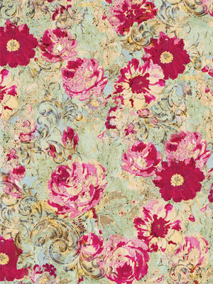 • Main Colors: Pink floral designs over a beige distressed background with hints of green and cream for additional texture and depth.