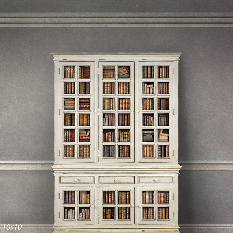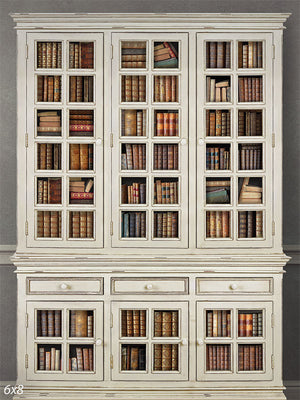 The Antique White Bookshelf Photography Backdrop is a carefully crafted scene that captures the beauty and sophistication of a classic library. The backdrop showcases an elegant, antique white wooden bookshelf with multiple glass-paned doors. Behind each door lies an assortment of leather-bound books, each with distinct colors and intricate designs. The overall design evokes a sense of history and intellectual charm, making it an excellent choice for photographers aiming to create an academic or literary ambiance in their shoots.