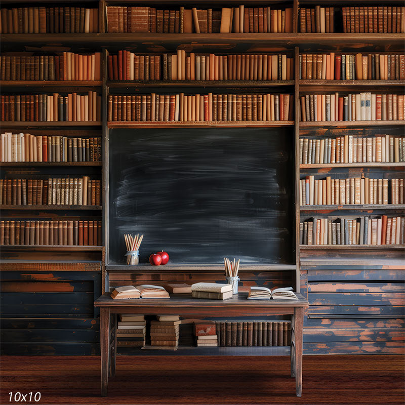 Flanking the chalkboard are bookshelves filled with an assortment of old books, their spines showcasing a range of colors and textures. The shelves are arranged with a mix of upright and horizontally stacked books, enhancing the depth and realism of the scene. The warm tones of the wooden furniture and the muted colors of the book spines create a cozy and inviting atmosphere, perfect for various types of photoshoots.