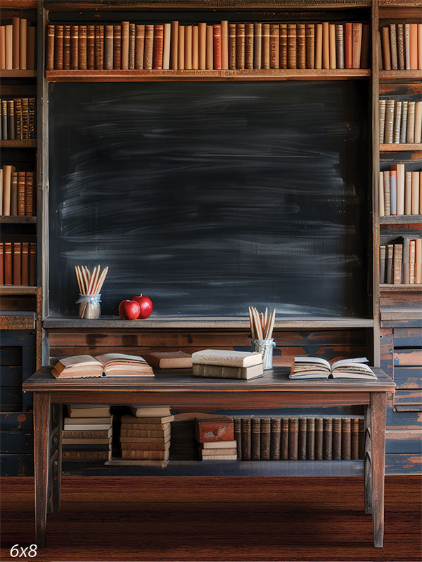 Immerse yourself in the timeless charm of an old-fashioned classroom with this meticulously designed photography backdrop. The scene is set with a classic wooden desk adorned with open books, jars of pencils, and a couple of red apples, evoking a sense of nostalgia. Behind the desk, a large chalkboard dominates the background, its surface showing traces of past lessons, adding to the authenticity and vintage feel.