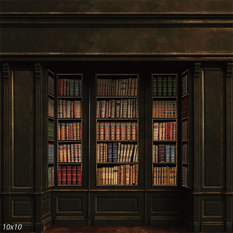 This exquisite backdrop transports you into a vintage library setting, where the dark, elegant bookshelf is filled with an assortment of leather-bound volumes. Each book is meticulously arranged, showcasing a rich tapestry of colors ranging from deep reds and browns to muted golds and greens. The intricate detailing on the book spines adds to the authenticity and charm of this scene, making it ideal for a variety of photography themes.