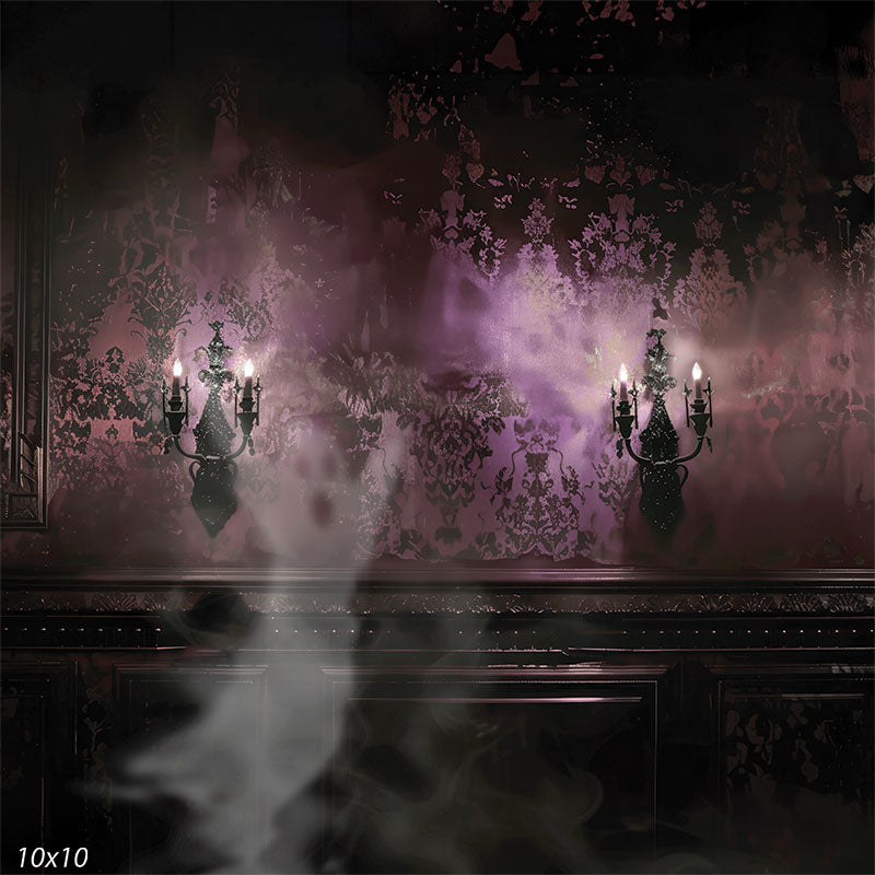 • General Description: A dramatic and atmospheric photography backdrop featuring deep purple damask wallpaper, ornate black sconces with glowing candlelight, and ambient smoke drifting through the scene.