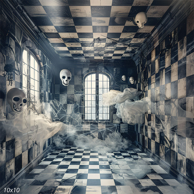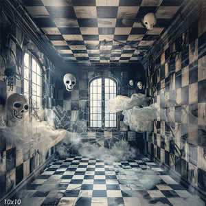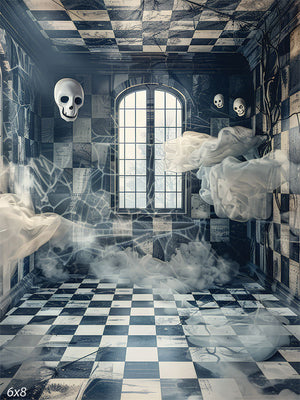 • General Description: A haunted gothic-themed photography backdrop with checkered tiles, floating skulls, ghostly fog, and a gothic window. This setup is perfect for eerie and supernatural photoshoots.