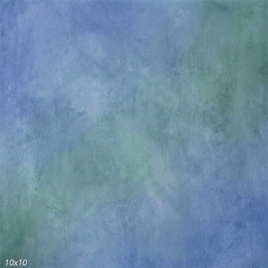 This photography backdrop presents a soft pastel blend of light blue and muted green tones with a painted-style texture that transitions smoothly behind a person in studio portrait settings. The printed photography backdrop maintains a calm, airy appearance, allowing the background to add gentle color and depth without drawing attention away from facial features or expression.