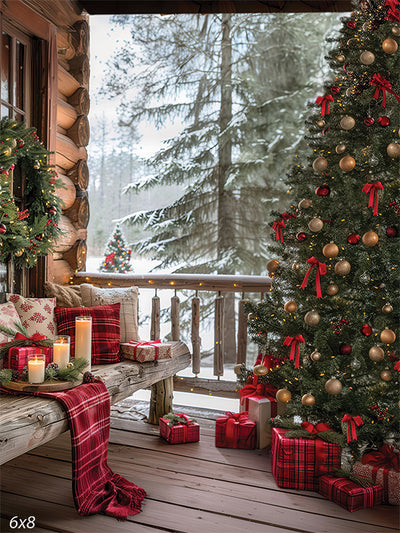 Immerse your studio in the warmth and charm of the holidays with the Cozy Log Cabin Christmas Tree Printed Photography Backdrop. This inviting scene features a rustic wooden porch adorned with glowing candles, plaid-wrapped gifts, evergreen wreaths, and a fully decorated Christmas tree set against a peaceful snow-covered forest. Ideal for capturing heartfelt holiday moments, this backdrop offers an atmosphere that feels both luxurious and homey.