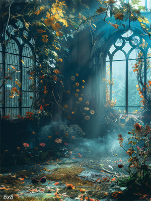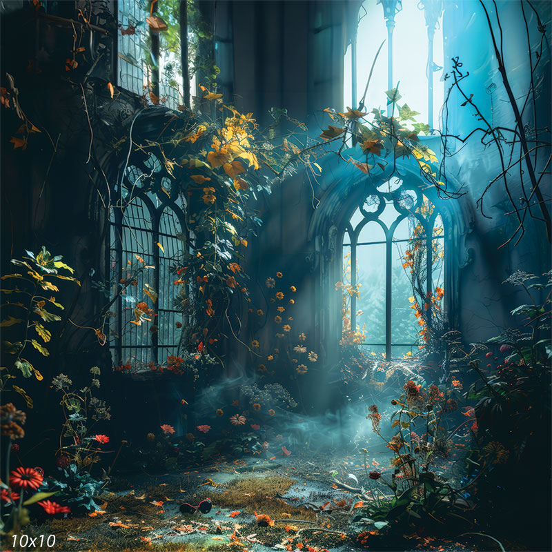 • General Description: An enchanting backdrop of an abandoned chapel overtaken by nature, complete with gothic windows, autumn leaves, flowers, and streaming sunlight. Perfect for creating a whimsical, fairy tale setting.