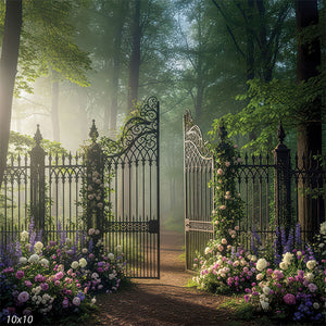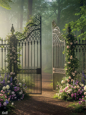 Open the door to wonder with the Fairytale Garden Gate Photo Backdrop. An ornate wrought-iron gate, softened by roses and hydrangeas, invites your subjects into a misty woodland scene—helping you create timeless images with ease.