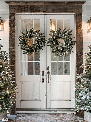 Set the scene for charming winter portraits with the Farmhouse Christmas Porch with Double Doors Printed Photography Backdrop. This festive entryway features vintage white double doors adorned with lit evergreen wreaths, flanked by snow-kissed Christmas trees and rustic wood accents. Perfectly styled to evoke a cozy, farmhouse holiday welcome, this backdrop offers a clean and classic look ideal for both lifestyle and portrait photography.