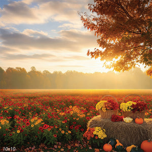 Celebrate the beauty of harvest season with this vibrant field backdrop, filled with golden sunlight, colorful blooms, and rustic fall accents. Perfect for fall mini sessions, it brings the warmth and richness of an autumn afternoon straight into your studio.