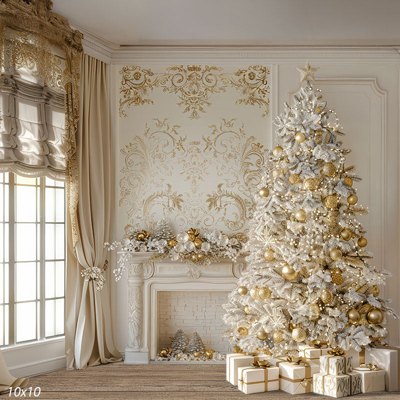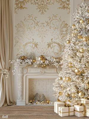 Elevate your holiday photo sessions with the opulent charm of the Luxury White and Gold Christmas Tree & Fireplace Printed Photography Backdrop. This stunning scene showcases a flocked Christmas tree decorated with gold ornaments, paired with an ornate white fireplace and shimmering garland, all set against an intricately patterned gold-accented wall. Perfect for capturing sophisticated seasonal portraits, this backdrop adds elegance and glamour to any studio setup.