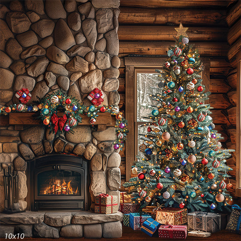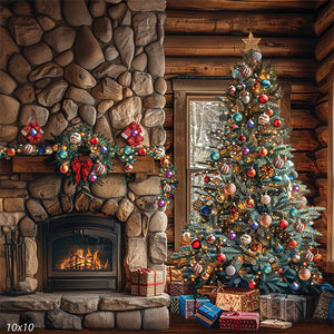 Bring the warmth and nostalgia of a holiday hearth into your studio with the Rustic Stone Fireplace & Christmas Tree Printed Photography Backdrop. This cozy holiday scene showcases a roaring fire framed by a rugged stone fireplace, a fully decorated Christmas tree sparkling with ornaments, and colorfully wrapped presents arranged beneath it. Designed to evoke the comfort of a mountain lodge during the holidays, this backdrop offers a timeless setting for festive photo sessions.