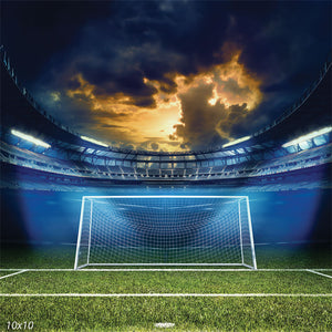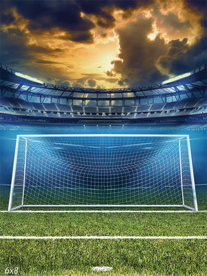 This captivating Soccer Goal in Stadium Photography Backdrop is a dynamic and inspiring addition to any professional photographer's studio. The backdrop features a detailed image of a soccer goal standing proudly on a lush, green field under the glow of stadium lights and a dramatic, cloud-filled sky at sunset. The stadium's towering structure surrounds the scene, creating an immersive environment that places the viewer right at the center of the action, ready to score the winning goal.