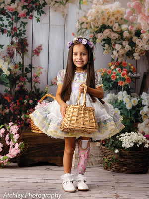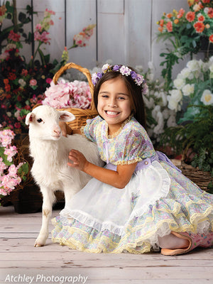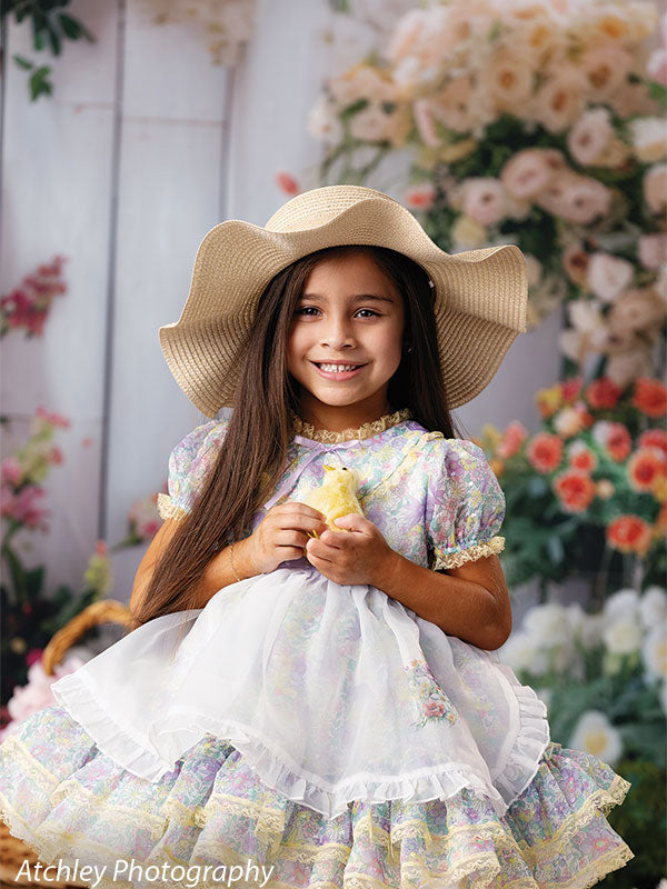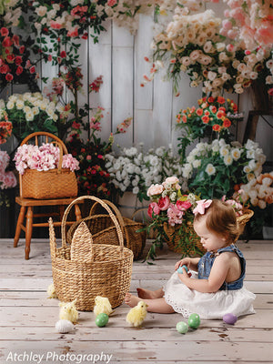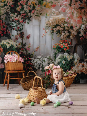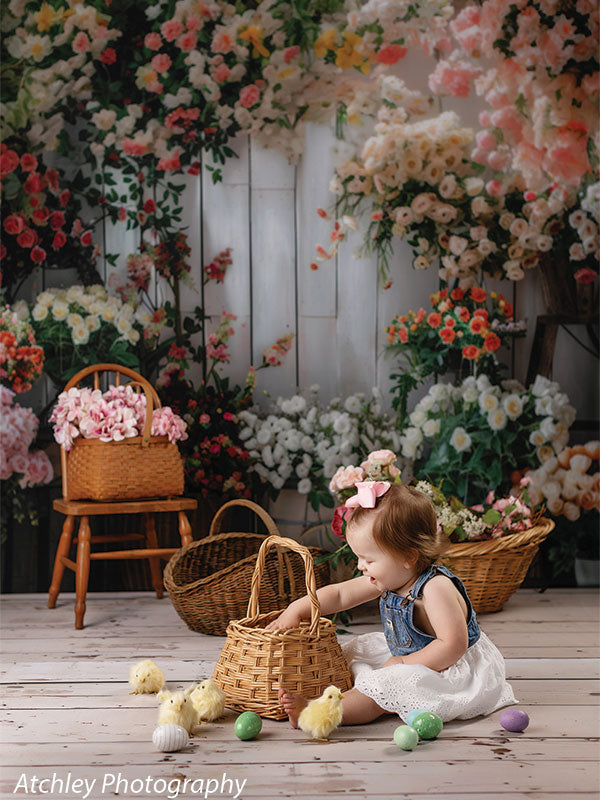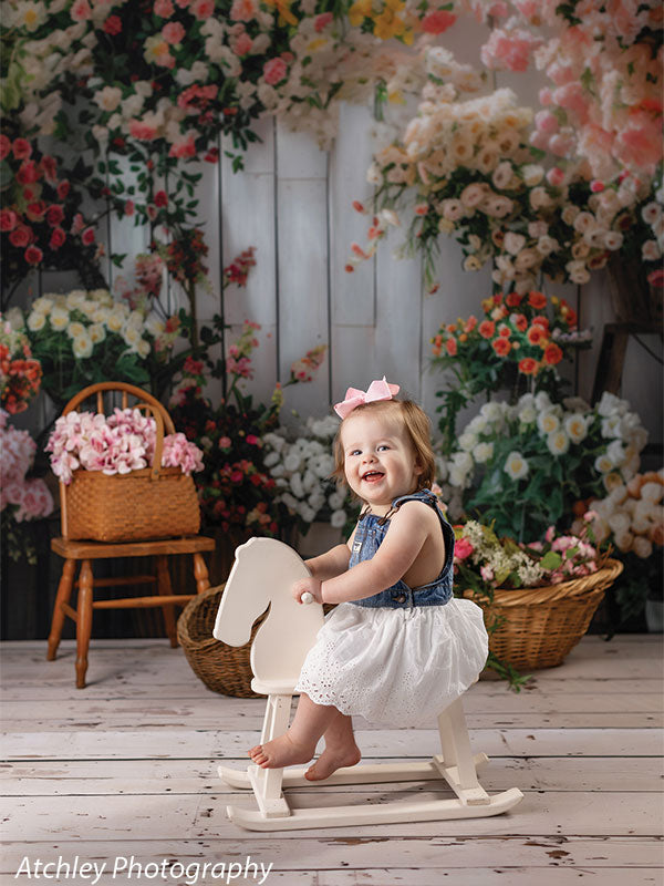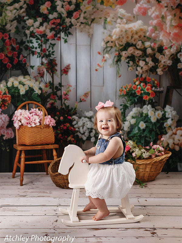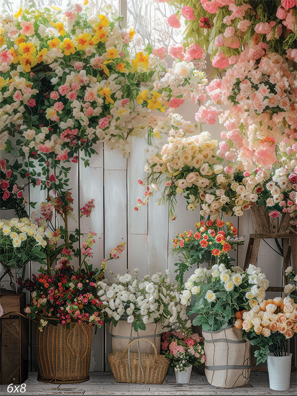 The Spring Flower Market Photography Backdrop captures the fresh, vibrant beauty of a flower market in full bloom. With cascading floral arrangements in bright hues of pink, yellow, and white, surrounded by natural wooden textures, this backdrop adds a cheerful and elegant touch to any photoshoot.