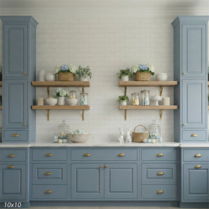 The tile grid adds texture behind the face without competing for attention. Soft lighting on the blue cabinetry keeps the contrast manageable, so you won't fight heavy shadows during the shoot. This design fits Easter sessions or spring portraits where you need a finished room look. It holds the subject nicely within the center columns.