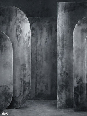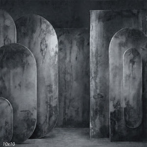 This photography backdrop presents a layered studio environment built from tall oval and rectangular panel forms finished in cool charcoal and slate gray tones. The studio background shows rounded arch silhouettes arranged at varying depths against a continuous wall and floor, creating controlled dimensional separation while keeping a person in frame visually dominant. Mottled, concrete-style texture and a matte surface finish maintain even light response without glare.