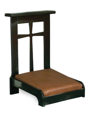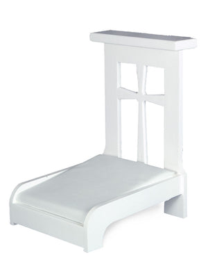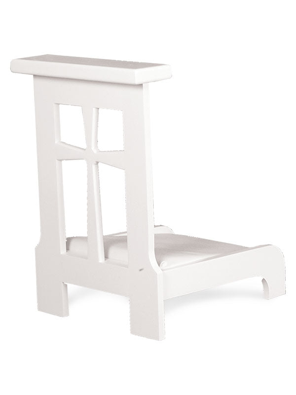 Kneeling posing photography prop for First Communion portraits is hand constructed of wood and features a cross inset with a cushioned area for kneeling. This posing prop is available in either a brown or white finish.