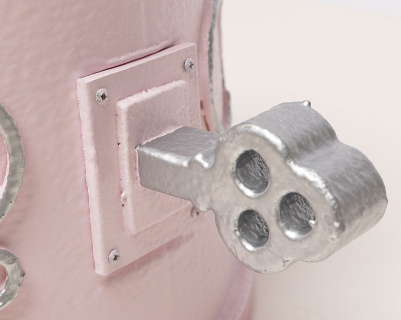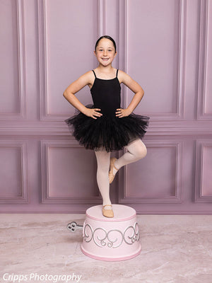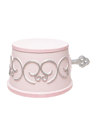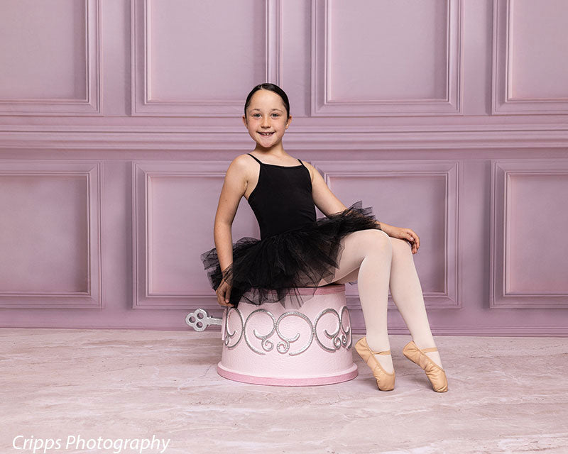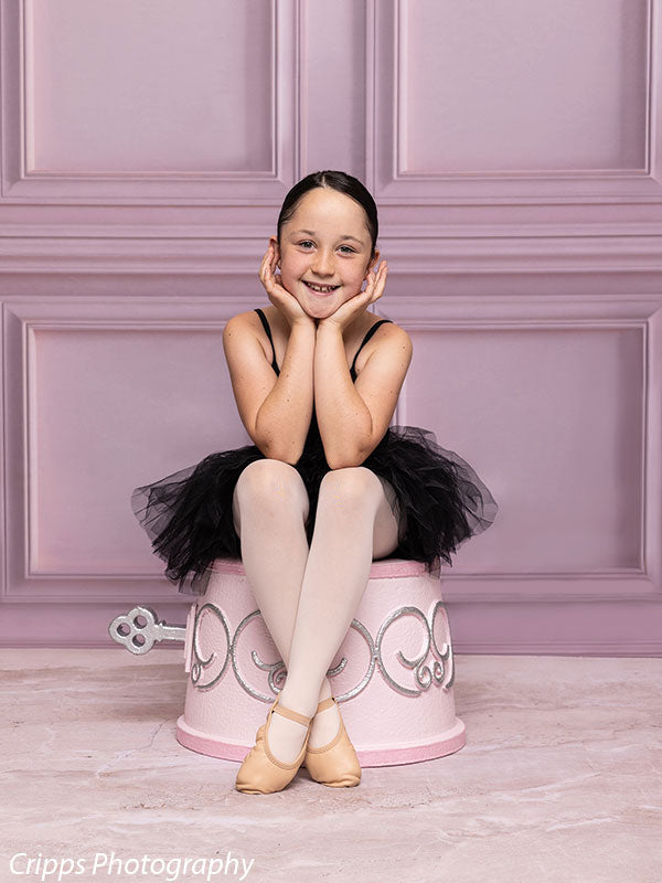 A beautifully crafted pink music box photography prop featuring silver scrollwork and a winding key. Perfectly sized for children, this whimsical base adds a storybook feel to ballet-themed and fantasy portrait sessions.