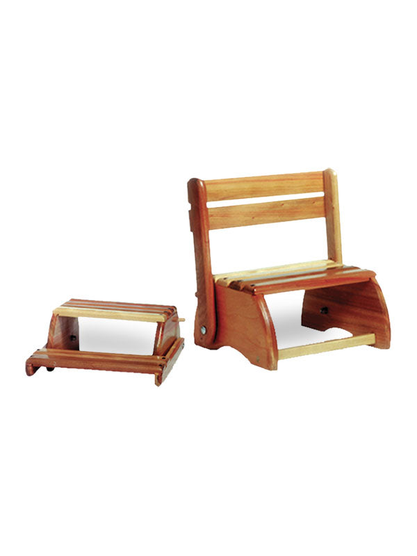 Children's wood step stool and bench all in one prop. The back rest folds down so it can be used as a stool or leave it up for a bench.