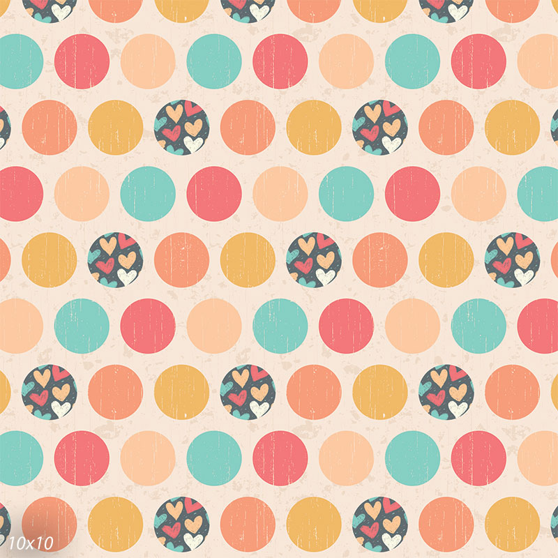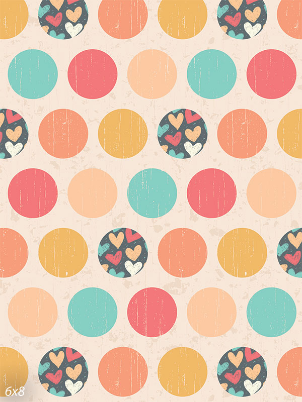 The Polka Dot and Hearts Photography Backdrop is a vibrant, playful design that combines large polka dots in pastel pinks, oranges, aquas, and yellows with whimsical heart accents. This backdrop is perfect for children's photoshoots, family portraits, birthday celebrations, and more.