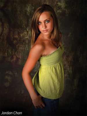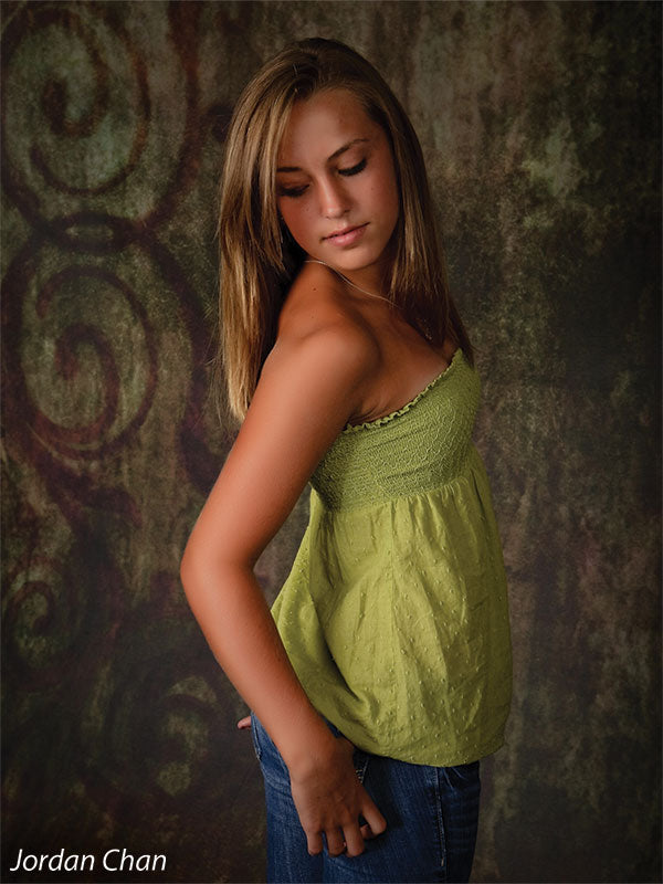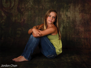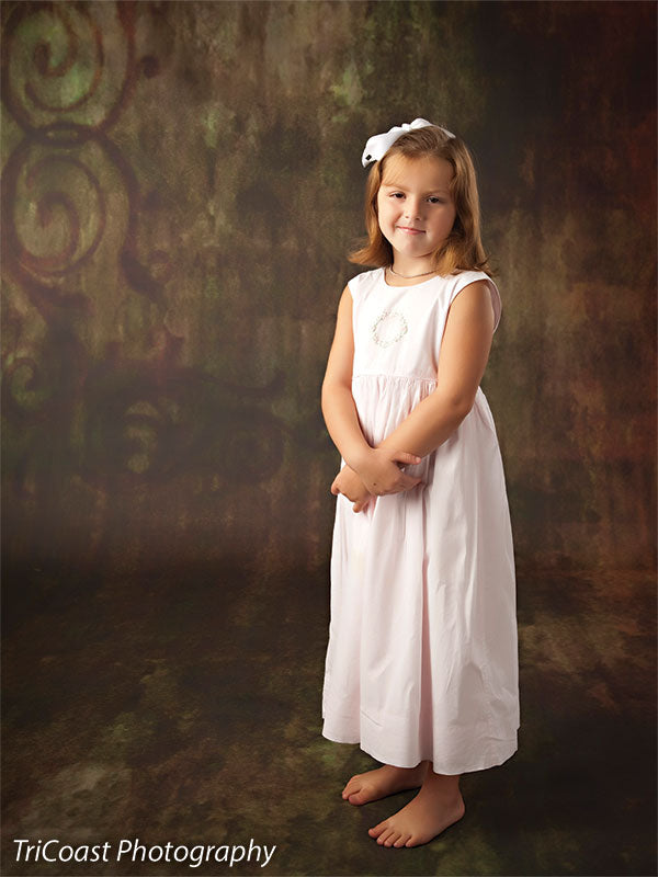The Scrolled Photography Backdrop combines rustic elegance with a painterly grunge aesthetic, featuring a rich blend of mossy green, earthen red, and muted amber tones. A faded ornamental scroll detail adds vintage charm and directional balance, perfect for creating classically inspired studio setups with a modern edge. This backdrop delivers visual texture and organic color flow that enhances both dramatic and soft portraiture.