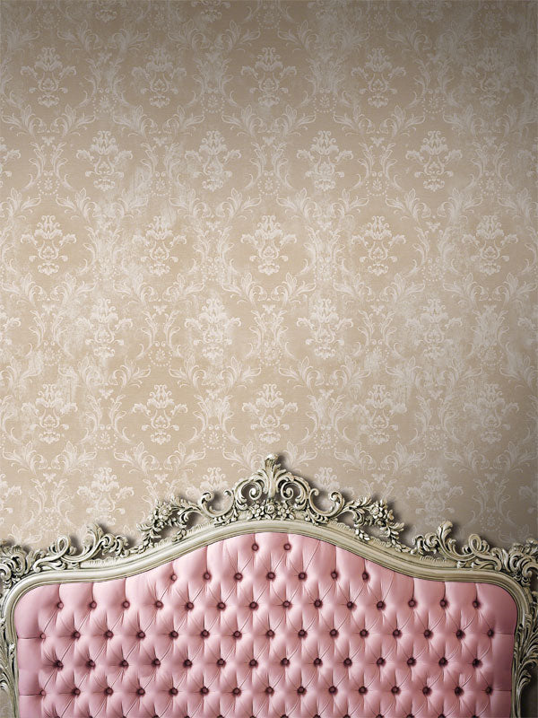 The Elegant Beige Damask Photography Backdrop with Pink Vintage Upholstered Headboard offers a beautiful, sophisticated setting for photographers aiming to capture timeless and elegant imagery. The beige damask pattern is complemented by the ornate, tufted pink headboard, creating a refined look suitable for both portrait and product photography.