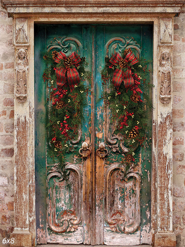 The Rustic Christmas Door Photography Backdrop is a perfect choice for creating a cozy, vintage holiday scene. Featuring a weathered wooden door adorned with festive garlands, plaid bows, red berries, and pine cones, this backdrop is ideal for holiday portraits, family photoshoots, and festive product photography. The door’s distressed teal paint and ornate design, paired with rustic holiday decor, evoke a warm, nostalgic Christmas atmosphere.