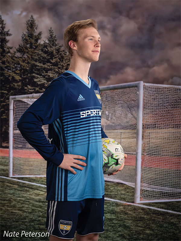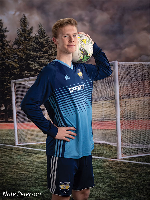 • Main Colors: Dark stormy grays, rich greens for the soccer field, and clean white lines of the goal and field markings.