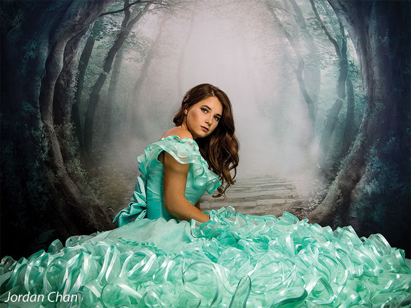 The gentle mist and distant light create a magical ambiance, ideal for children’s storytelling photoshoots or adult portraits that evoke a sense of wonder and adventure. The detailed imagery of the stone path and tree arch provides a high-quality background for both indoor and outdoor sessions, allowing photographers to capture stunning, imaginative images that clients will treasure.