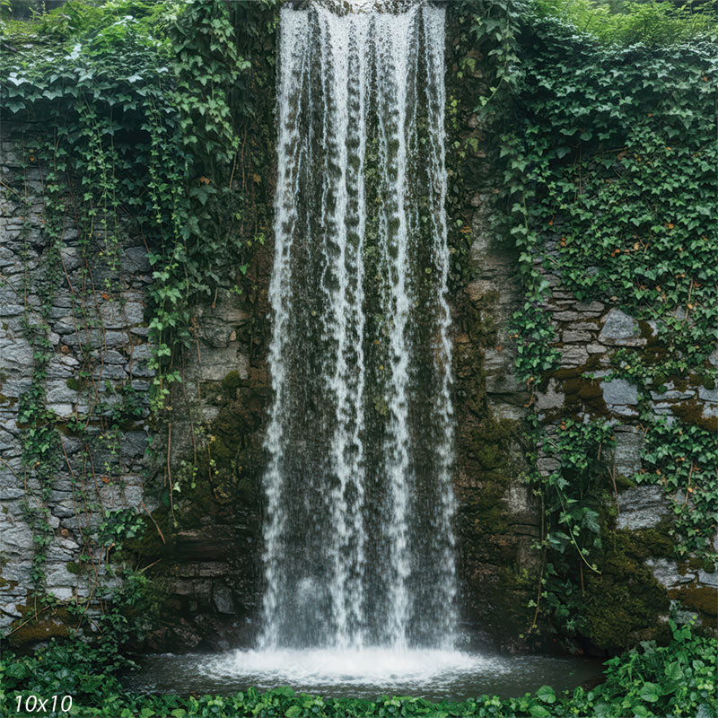 This printed photography backdrop shows a vertical garden waterfall spilling into a small pool, set into a weathered stone wall with mossy areas and trailing ivy on both sides. Bright water highlights run down the center while the surrounding stone and foliage stay deep green and gray, creating a natural, high-contrast feature behind a person positioned in front of the backdrop.