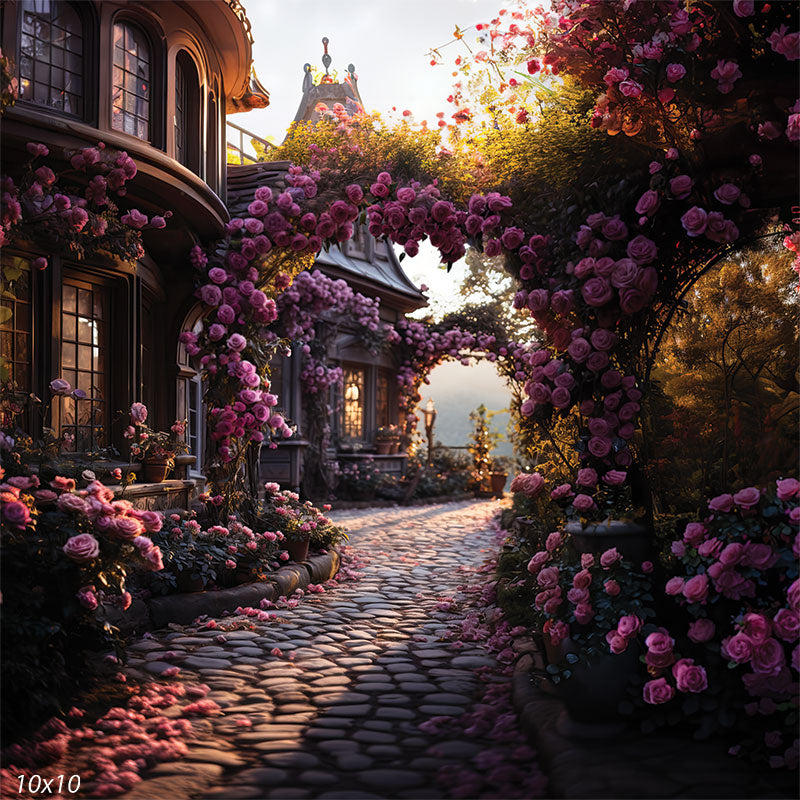 Transform your photography studio with our Enchanted Rose Garden Pathway Photography Backdrop. This captivating backdrop features a charming cobblestone pathway lined with lush rose bushes arching overhead. The scene evokes a fairy-tale ambiance, perfect for romantic and whimsical photoshoots. The warm, golden light filtering through the roses adds an enchanting glow to the backdrop, making it ideal for capturing dreamy and magical moments.