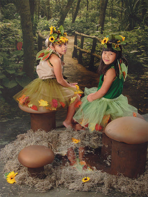 The Fern Grotto Photography Backdrop features a serene woodland scene with a narrow mossy pathway, rustic handrail bridge, and dense green foliage under dappled sunlight. This immersive forest setting creates a peaceful, storybook-style environment for portrait photography, offering both visual depth and natural detail.
