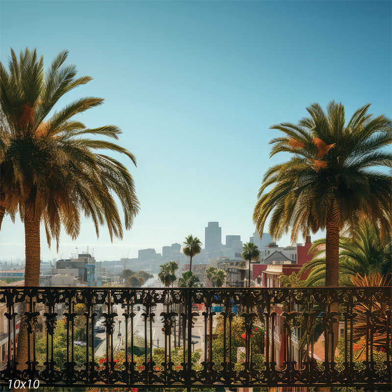 The backdrop is perfect for various scenarios, such as lifestyle photography, urban portraits, travel-themed shoots, and promotional content that requires a touch of city life combined with the relaxing presence of palm trees. The high-resolution image ensures that every detail, from the intricate iron balcony in the foreground to the distant skyscrapers, is captured with stunning clarity, providing a professional-quality background that enhances the overall impact of your photos.