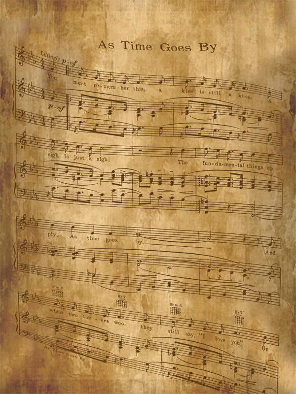 Celebrate the timeless beauty of music with the Sheet Music Photography Backdrop. Featuring an aged parchment background overlaid with the iconic "As Time Goes By" musical score, this backdrop evokes nostalgia, romance, and artistic charm. Its sepia tones and vintage texture create a warm, classic atmosphere perfect for portraits, recitals, and themed photo shoots.
