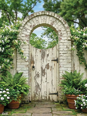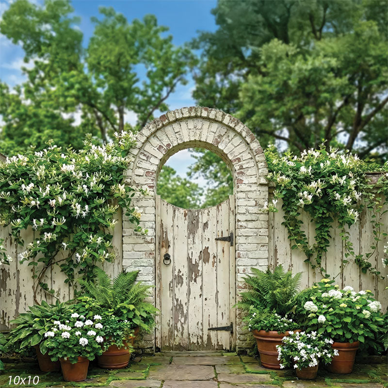 This photography backdrop presents a centered white brick arch with a weathered wooden garden gate, framed by climbing vines, potted greenery, and a stone walkway that leads into the scene. Soft off-white brick tones, distressed painted wood, and layered green foliage create a balanced garden setting that reads naturally behind a portrait subject. The arched opening and subtle background depth provide visual structure while keeping attention on the person in front of the backdrop.