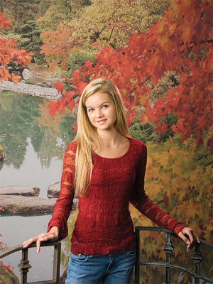 The Japanese Garden Photography Backdrop captures a serene moment in a traditional garden setting, with vivid fall foliage, still waters, and classic stone elements. Framed by brilliant red, orange, and golden leaves, this tranquil landscape invites peaceful, introspective portraits with timeless appeal.