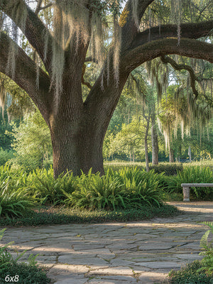 A massive live oak draped in Spanish moss anchors this scenic studio background. The scene includes a wide flagstone path winding through thick ferns, leading toward a stone bench in the shade. You have plenty of room on the paved area to frame a standing family or seated high school senior without the foliage crowding them.