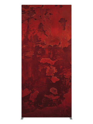 Torvin Deep Red Texture StudioEdge Backdrop Panel features a deep red abstract surface with layered paint-style texture, worn patches, and subtle vertical streaking. The tonal range moves between dark maroon and richer crimson areas with soft-edged distressed shapes that read as textured detail behind a portrait subject.