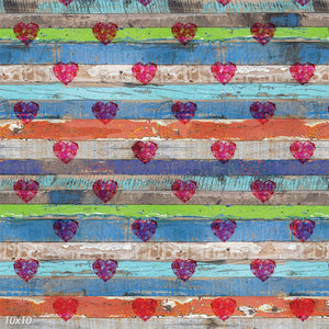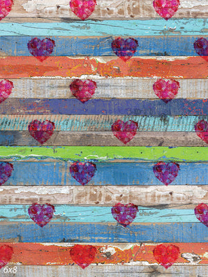 The Rustic Hearts and Stripes Photography Backdrop blends weathered wood textures with vibrant heart patterns, offering a perfect combination of rustic charm and playful colors. Featuring multicolored horizontal stripes with heart accents, this backdrop is ideal for family portraits, children's photoshoots, or romantic sessions.