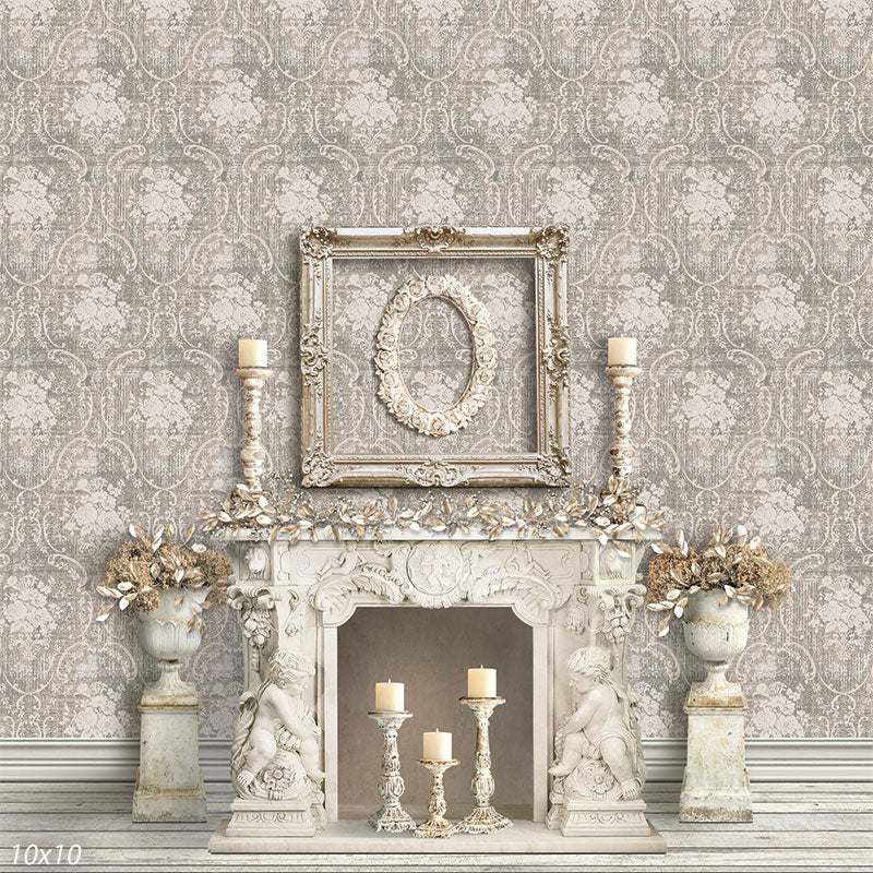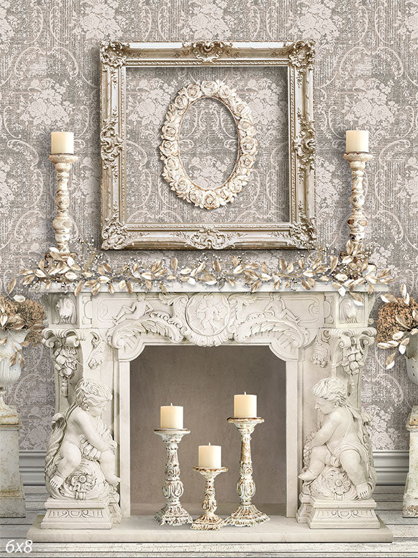 The Elegant Victorian Mantelpiece Photography Backdrop showcases an exquisite, timeless scene reminiscent of classic Victorian decor. This backdrop features a beautifully ornate white mantel adorned with delicate carvings, accented by intricate candle holders, and a lush garland. Above the mantel, a large, vintage-style picture frame serves as a focal point, adding depth and sophistication to the setting. The backdrop’s neutral color palette, consisting of soft creams and whites, creates a serene and elegant atmosphere perfect for a variety of photography themes.