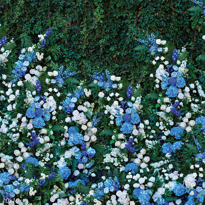 • Lush Floral Arrangement: Features a wall of vibrant blue and white flowers with rich green foliage, creating a natural and serene setting.