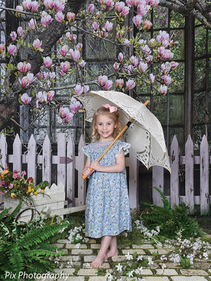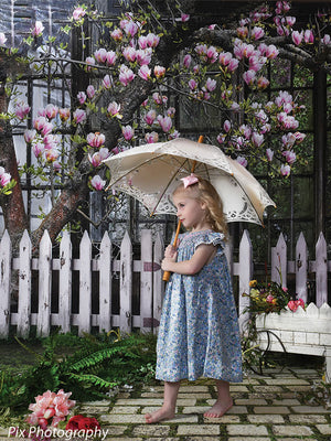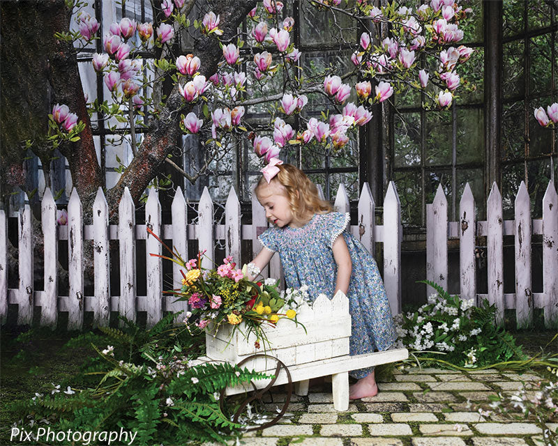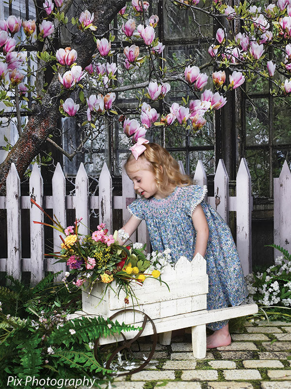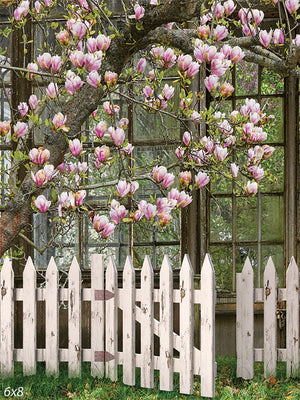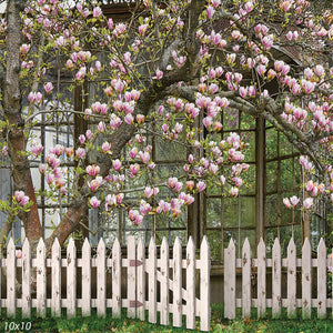 The Magnolia Blossom Garden Photography Backdrop captures the serene beauty of spring with its depiction of delicate magnolia blossoms cascading over a rustic white picket fence. The backdrop evokes a sense of timeless charm, making it an ideal setting for various photoshoot scenarios, especially those involving children and families. The backdrop's intricate details, including the weathered texture of the fence and the vibrant blossoms, create a perfect balance of softness and contrast, adding depth and warmth to any photograph. This backdrop is a must-have for photographers looking to bring a touch of nature and nostalgia into their shoots.