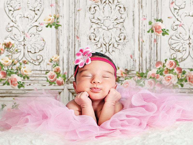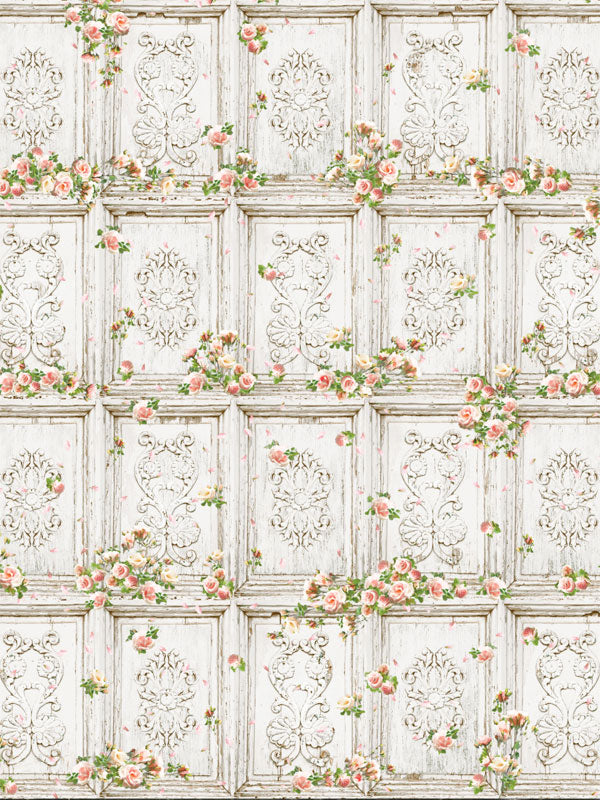 Capture the timeless beauty of vintage interior designs with the Vintage Ornate Floral Panel Photography Backdrop. Featuring intricately carved wood panels and delicate pink rose clusters, this backdrop brings elegance and romance to any photography session. Whether you're shooting portraits, product photography, or fashion editorials, this backdrop enhances every shot with its soft, muted colors and vintage charm.