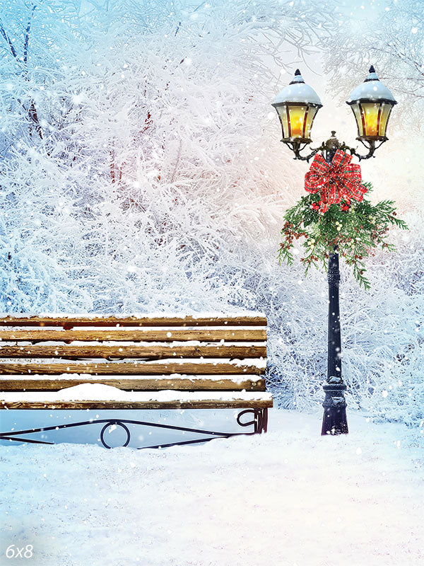 The Winter Park Bench and Lantern Photography Backdrop creates a serene winter scene with a rustic wooden bench and a vintage lantern adorned with a festive wreath. This backdrop captures the tranquil beauty of a snowy park, perfect for holiday and winter-themed photography sessions.