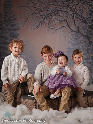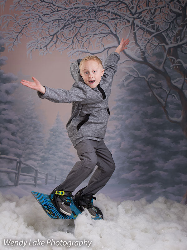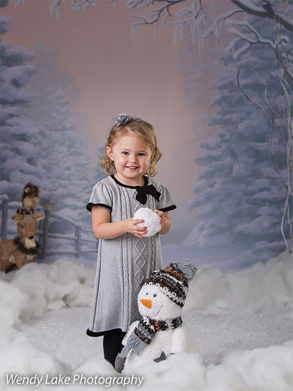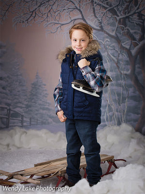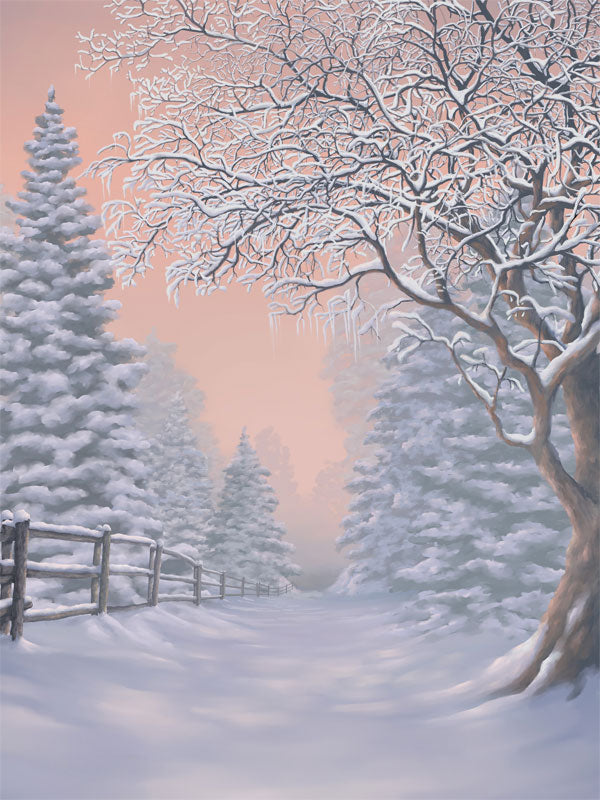 Capture the serene beauty of winter landscapes with the Country Winter Snowy Path Photography Backdrop. Featuring a hand-painted style scene with snow-covered pine trees, a rustic wooden fence, and a soft peach-hued sky, this backdrop offers a peaceful, storybook setting perfect for portraits, family sessions, and seasonal photography.